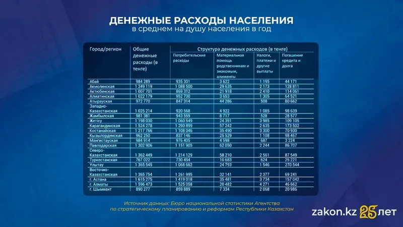 Фото: Zakon.kzПо сравнению с 2023 годом больше всего денежные расходы выросли в области Жетысу – на 19,5%, на втором месте Астана, где увеличение за год составило 15,9%. Наименьший рост наблюдался в Мангистауской (+2,4%) и Актюбинской (+2,6%) областях. Структура расходов Отметим, что основная часть денежных расходов (91,3%) приходится на потребление. Так, среднестрановой показатель по потребительским расходам составил 1 070 506 тенге. В структуре денежных расходов погашение кредитов и долгов составило 6,6% (77 045 тенге), на налоги, платежи и другие выплаты пришлось лишь 0,2% (2 122 тенге в среднем на душу населения), оставшаяся часть – это материальная помощь родственникам и знакомым или алименты – 1,9%, или 23 325 тенге. Наиболее высокий уровень потребительских расходов в Алматы – 1 525 058 тенге (95,5% от общей суммы), на втором месте по сумме Астана – 1 419 018 тенге (87,8%) и Карагандинская область – 1 290 899 тенге (84,7%). Обратим внимание, что самая высокая доля потребительских расходов в Мангистауской области – 99,1% и Шымкенте – 96,6%. Наиболее низкий уровень в Карагандинской, Кызылординской (87%) и Атырауской (87,1%) областях. Траты на погашение долгов и кредитов заняли почти пятую часть от общей суммы денежных расходов в области Улытау – 19,8%, или 270 544 тенге. Это самый высокий показатель по стране как в процентах, так и по сумме. В Актюбинской и Карагандинской областях доля таких расходов составила 11,3% и 11,4% соответственно. Меньше всего расходовали на кредиты в Шымкенте – 2,4% (20 986 тенге) и Мангистауской области – всего 0,3% (3 224 тенге) от общей суммы денежных расходов в регионе.